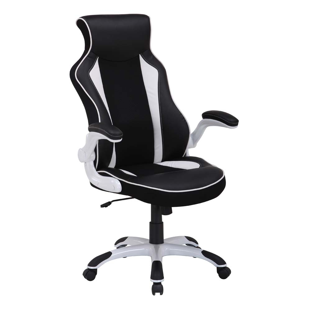 Модерен офис стол с повдигащи се подлакътници с размери Ш:72/Д:70/В:117.5-125 см. Подобрете работната атмосфера в офиса, като създадете комфортна и креативна атмосфера на вашият екип. Столът е изключително комфортен, произведен от висококачествени материали, като със сигурност ще ви служи вярно дълги година. Моделът притежава ергономична седалка и облегалка с монтирани два подлакътника, на която може да се доверите по време на дългите работни часове. Столът е стилно тапициран с висококачествена еко кожа и текстил с пълнеж от PU пяна. Може да се върти на 360°, както и лесно да се позиционира посредством пет двойни колелца.